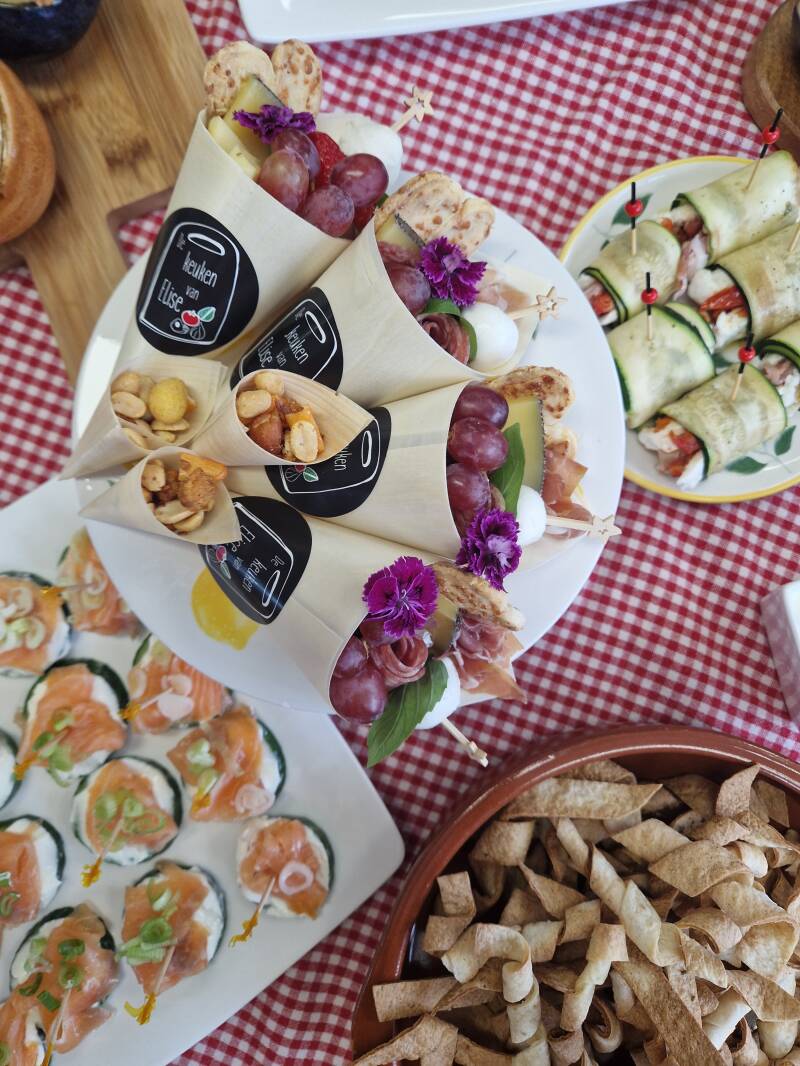 Ook kunnen we een leuke bamboe-cone vullen met antipasti, super leuk als traktatie of tussendoortje op je feest/borrel. Deze bevat een prikker met vleeswaren, basilicum en kaas, losse vleeswaren/worsten en een puntje kaas met een trosje druiven, kaaskoekjes en een eetbare bloem. Plus een mini-cone met nootjes. Ze kosten € 7,50 per stuk en zijn vanaf 10 stuks te bestellen.