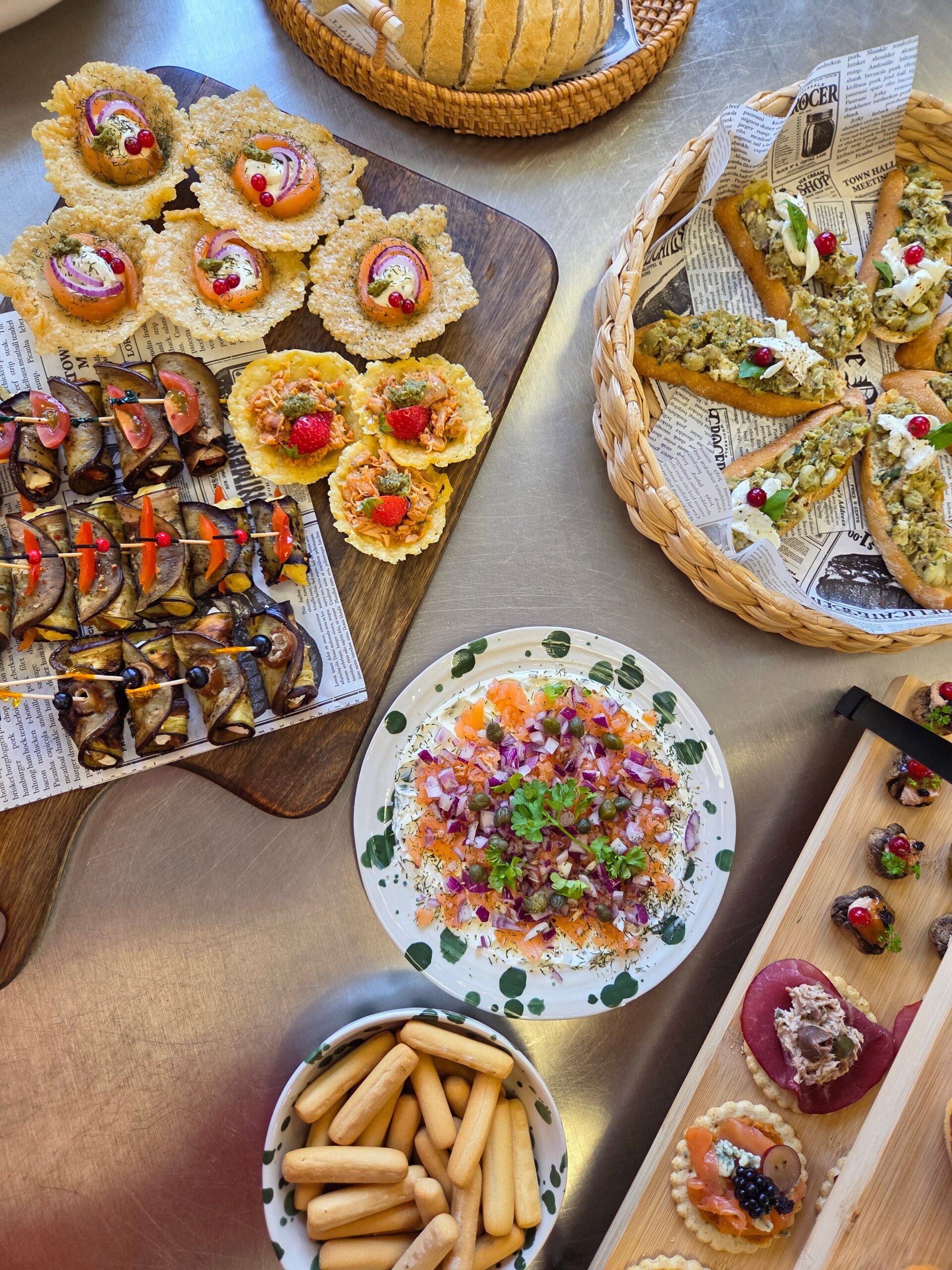 - Bord met smeersel met roomkaas, zalm, rode ui, kappertjes en peterselie € 8,25
