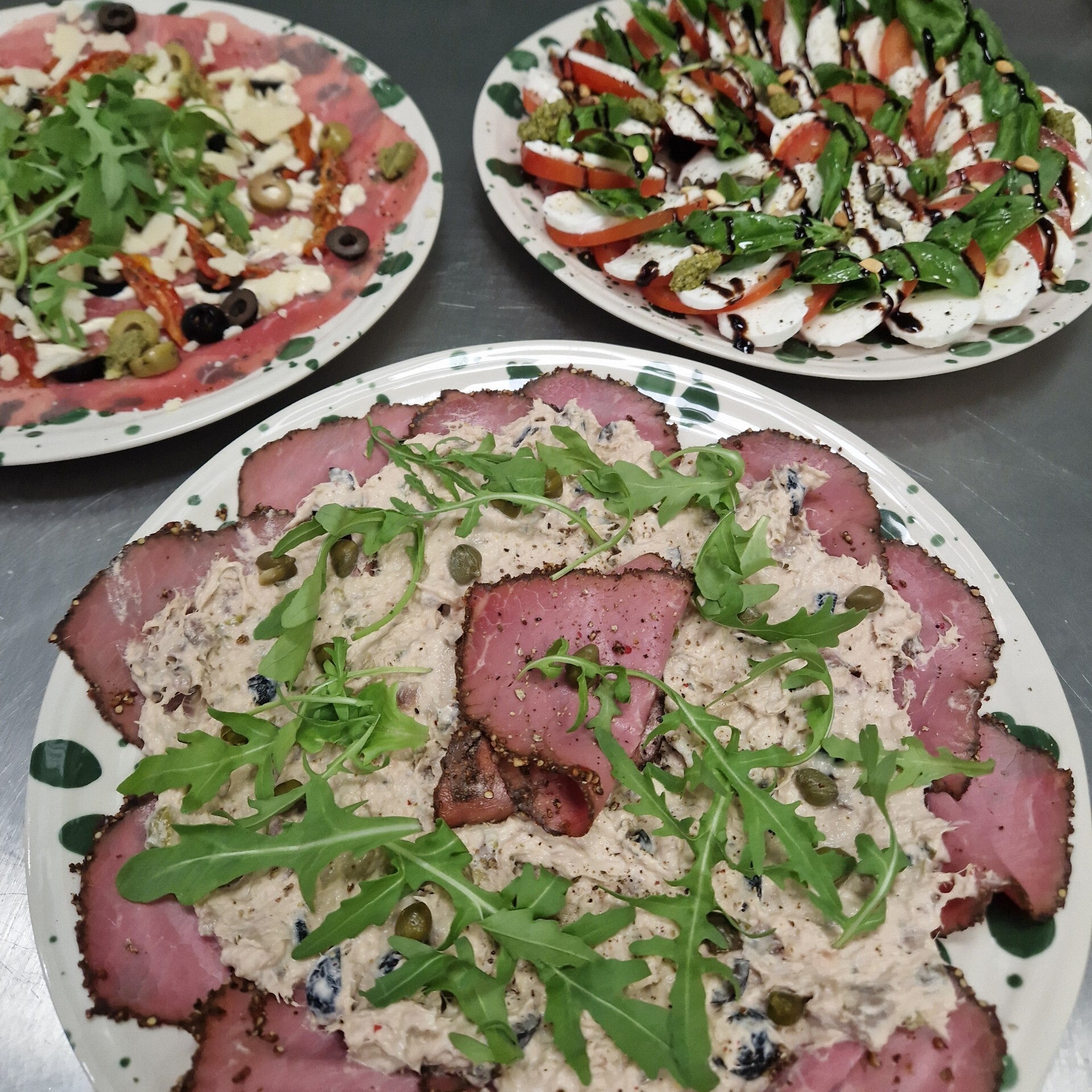 - Bord met carpaccio, parmezaan, olijven, zongedroogde tomaten, pijnboompitten en rucola € 23,50