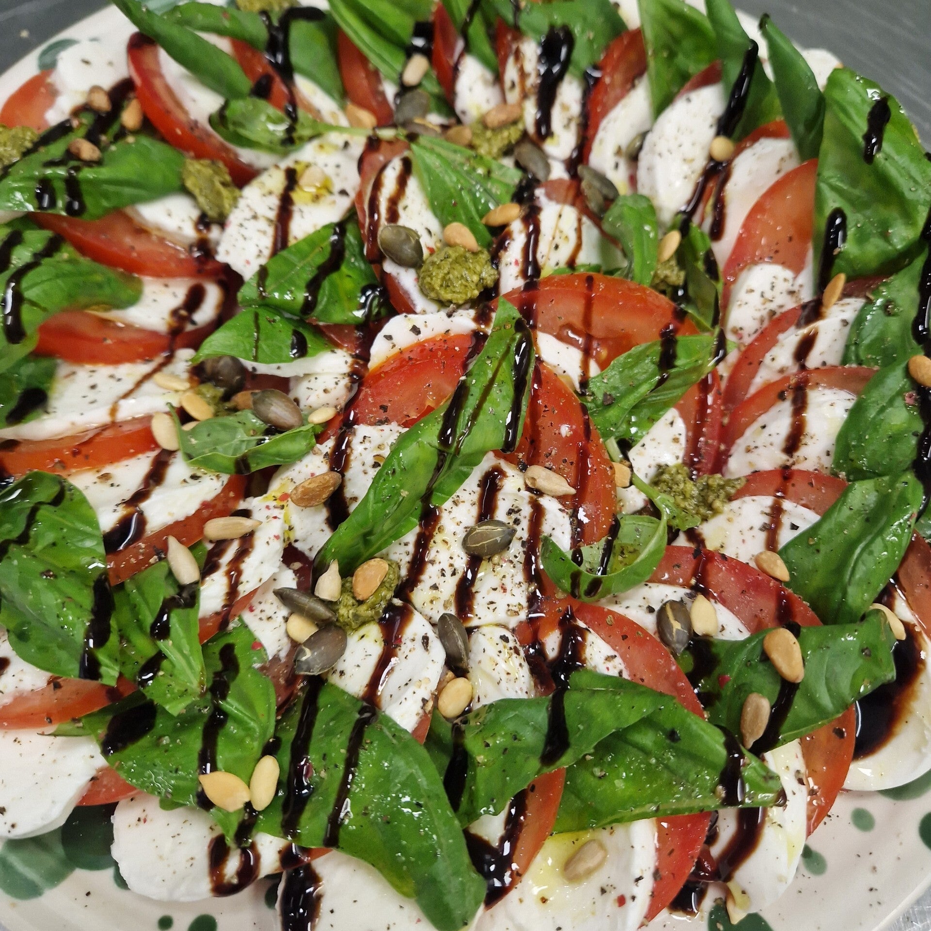 - Bord met caprese; buffelmozzarella, tomaat, basilicum, peper, zout, olijfolie, pesto en crema di balsamico € 23,50